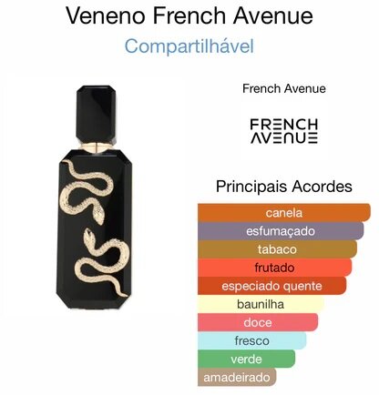 Veneno de French Avenue es una fragancia de la familia olfativa Aromática Frutal para Hombres y Mujeres. Esta fragrancia es nueva. Veneno se lanzó en 2025. La Nariz detrás de esta fragrancia es Jean-Louis Sieuzac. Las Notas de Salida son manzana, Humo y canela; las Notas de Corazón son tabaco y musgo; las Notas de Fondo son vainilla Bourbon y Orcanox™.